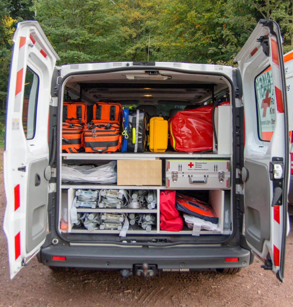 Für die unterschiedlichen Einsatzzwecke haben Wir, unser MTW im Kofferraum nach unseren Wünschen und aufgaben ausgebaut, sodass mehrere Sanitätsrucksäcke, Beatmungsequipment, AED und diverse weitere Ausrüstung im Fahrzeug Platz finden.